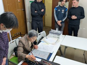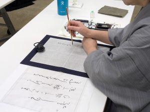隣の部屋では大きな筆で書いていたので、学生さんたちはまったく違う雰囲気の小筆の筆遣いを興味深そうに見ていました。