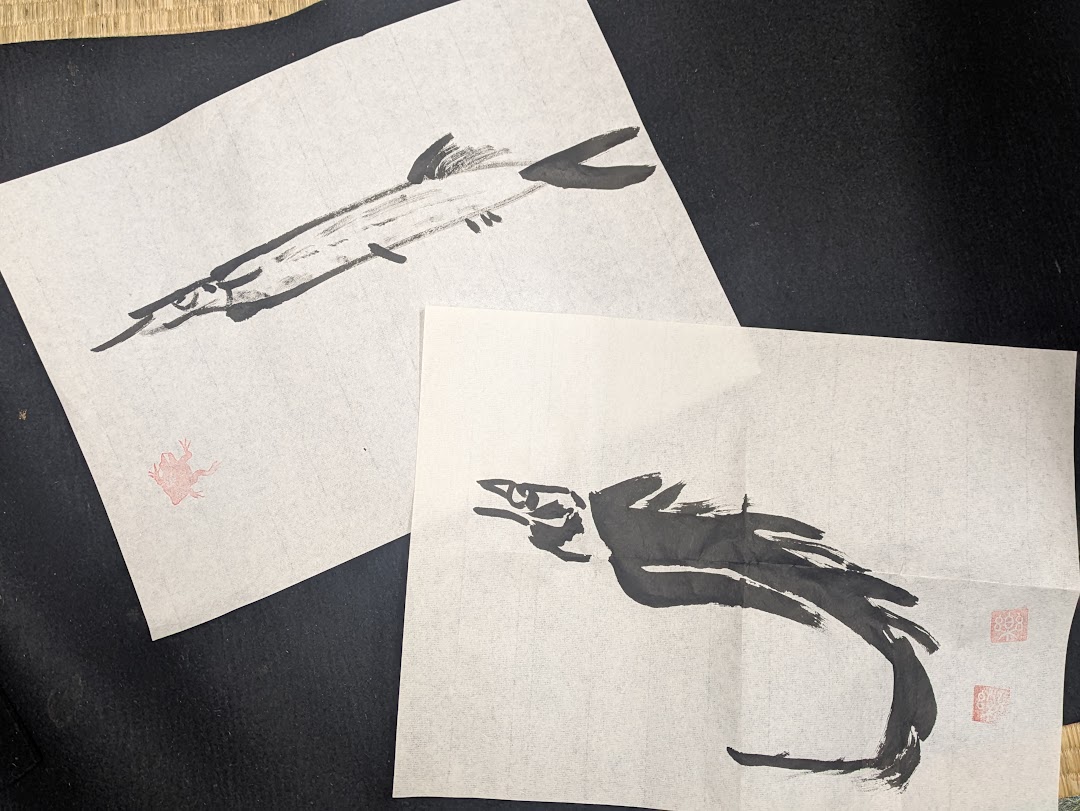 今回は魚大好きえいりちゃんが大御所の風格で墨絵をしたためていました^^